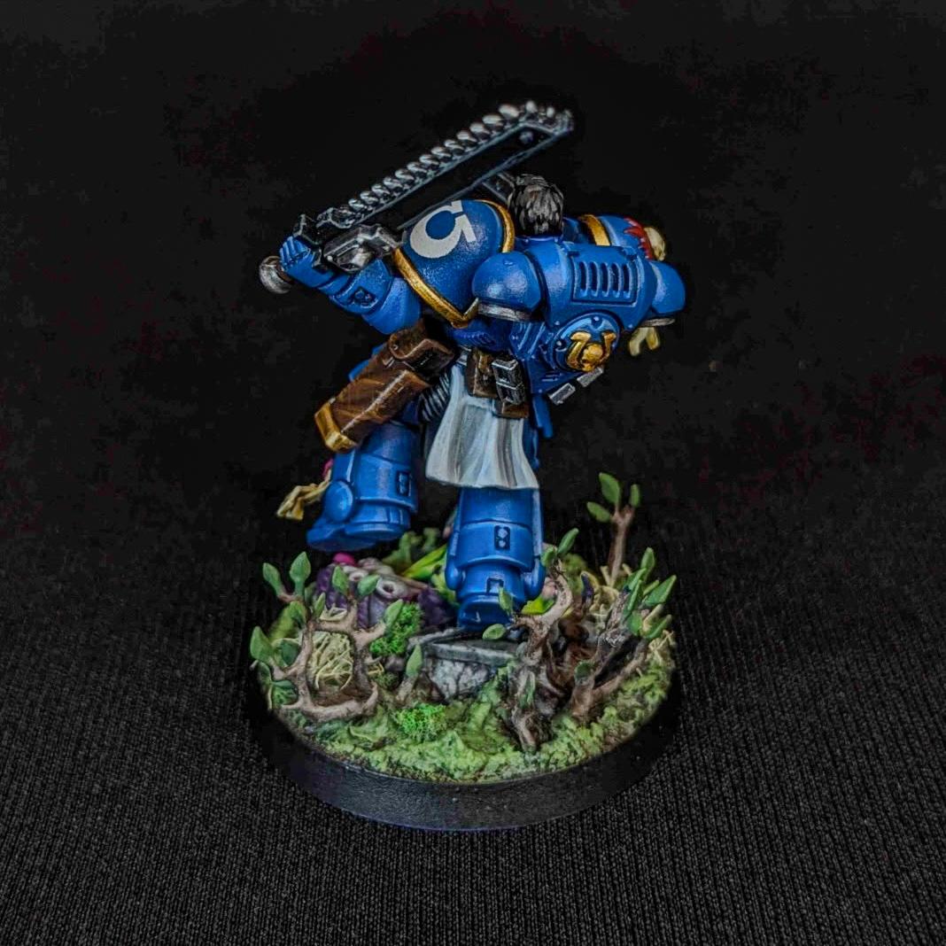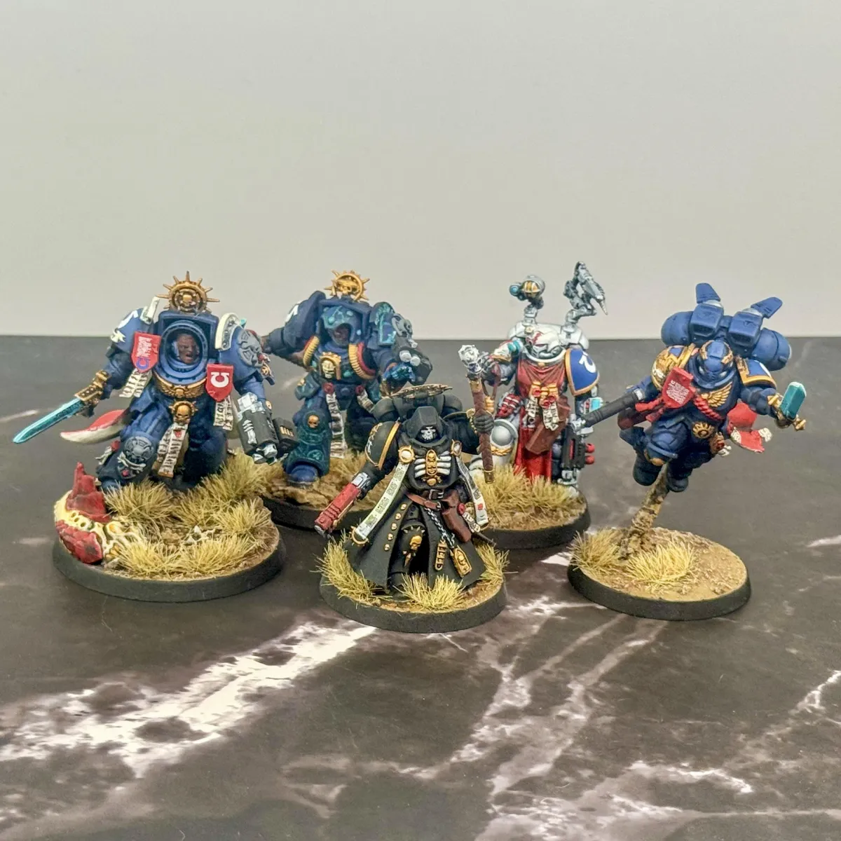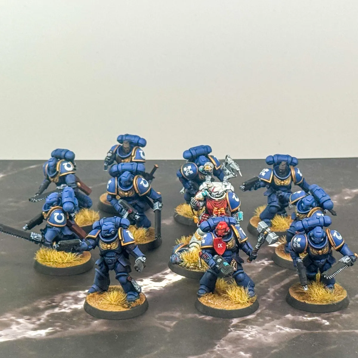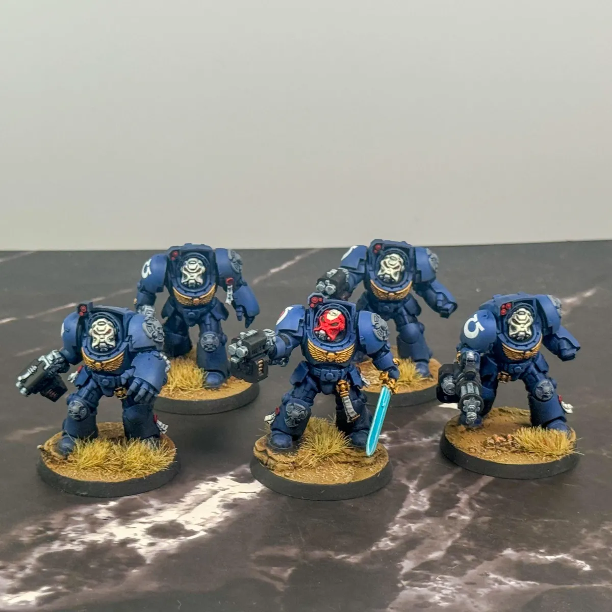The customer wanted a cohesive, battlefield-ready 1,000 point army that balanced lore accuracy, personalization, and visual impact. Most of the army arrived preassembled by the client, with additional units built fresh from the box by our artist to complete the force. Careful attention was given to heraldry, company markings, and iconography to ensure every model aligned faithfully with Ultramarines lore. To make the army truly personal, skin tones were tailored to reflect the customer's identity. The Eliminators feature custom brown camouflage cloaks designed to harmonize with the basing environment colors, which were intentionally selected to enhance and elevate the iconic blue of the Ultramarines armor.