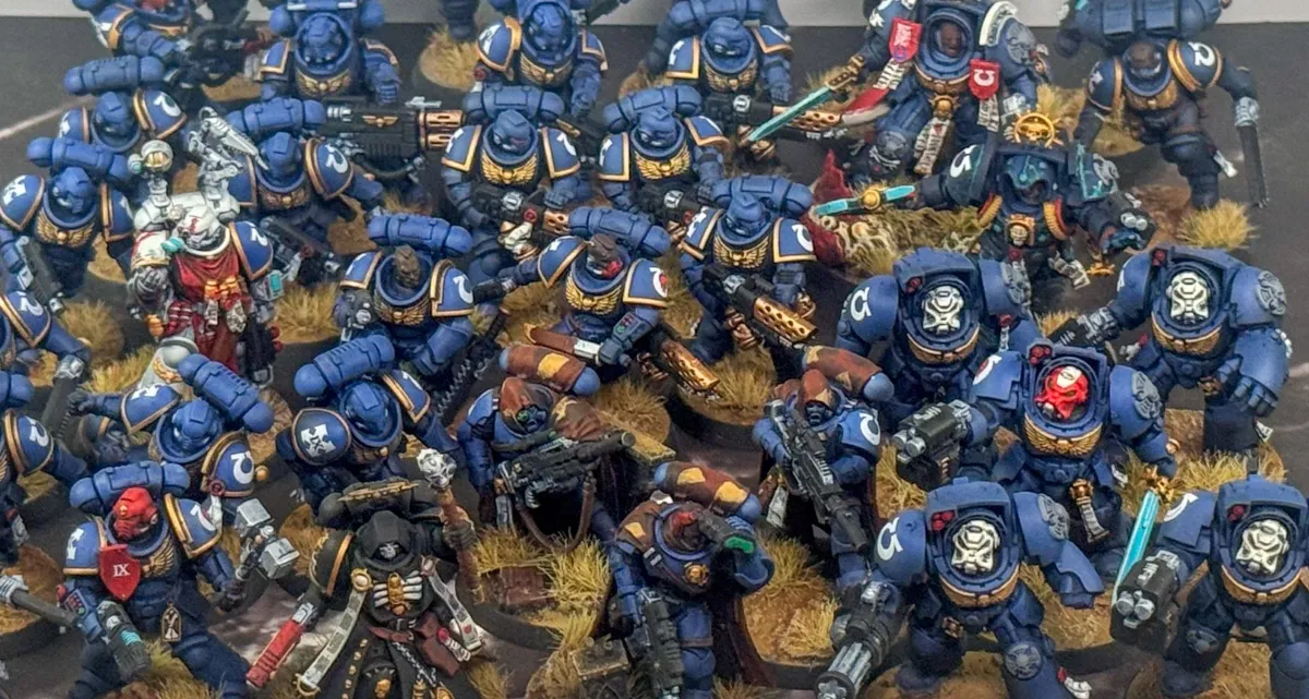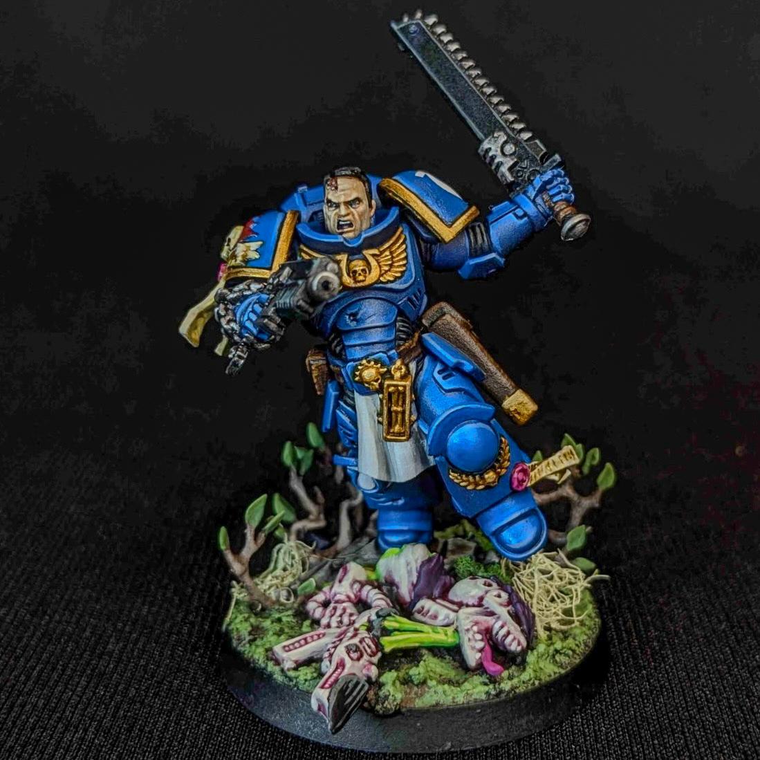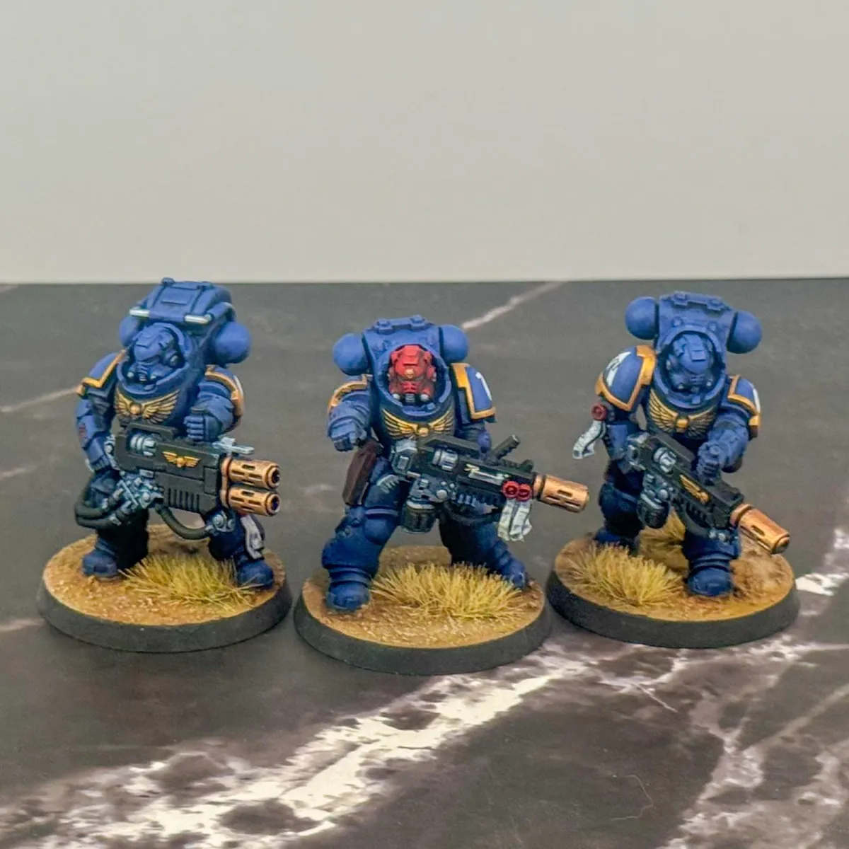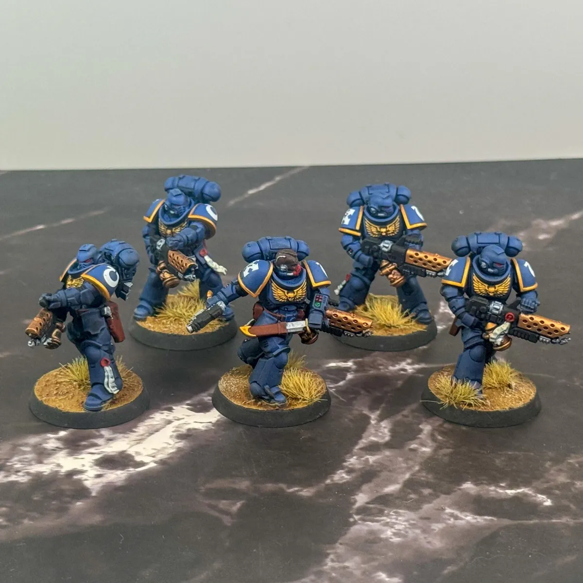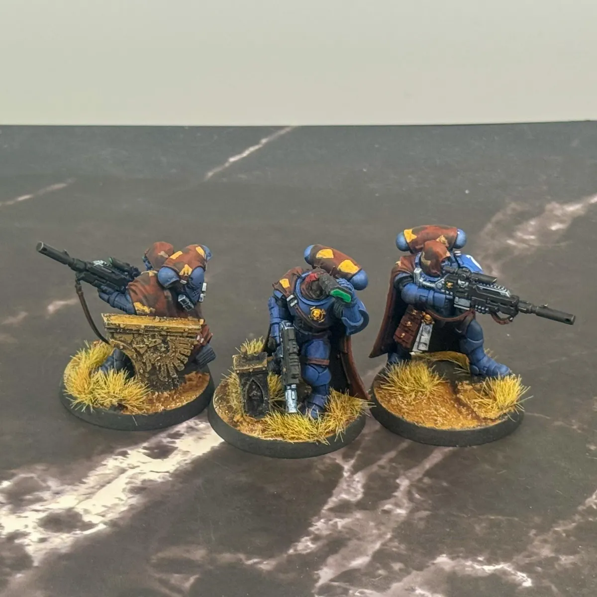 The customer wanted a cohesive, battlefield-ready 1,000 point army that balanced lore accuracy, personalization, and visual impact. Most of the army arrived preassembled by the client, with additional units built fresh from the box by our artist to complete the force. Careful attention was given to heraldry, company markings, and iconography to ensure every model aligned faithfully with Ultramarines lore. To make the army truly personal, skin tones were tailored to reflect the customer's identity. The Eliminators feature custom brown camouflage cloaks designed to harmonize with the basing environment colors, which were intentionally selected to enhance and elevate the iconic blue of the Ultramarines armor.