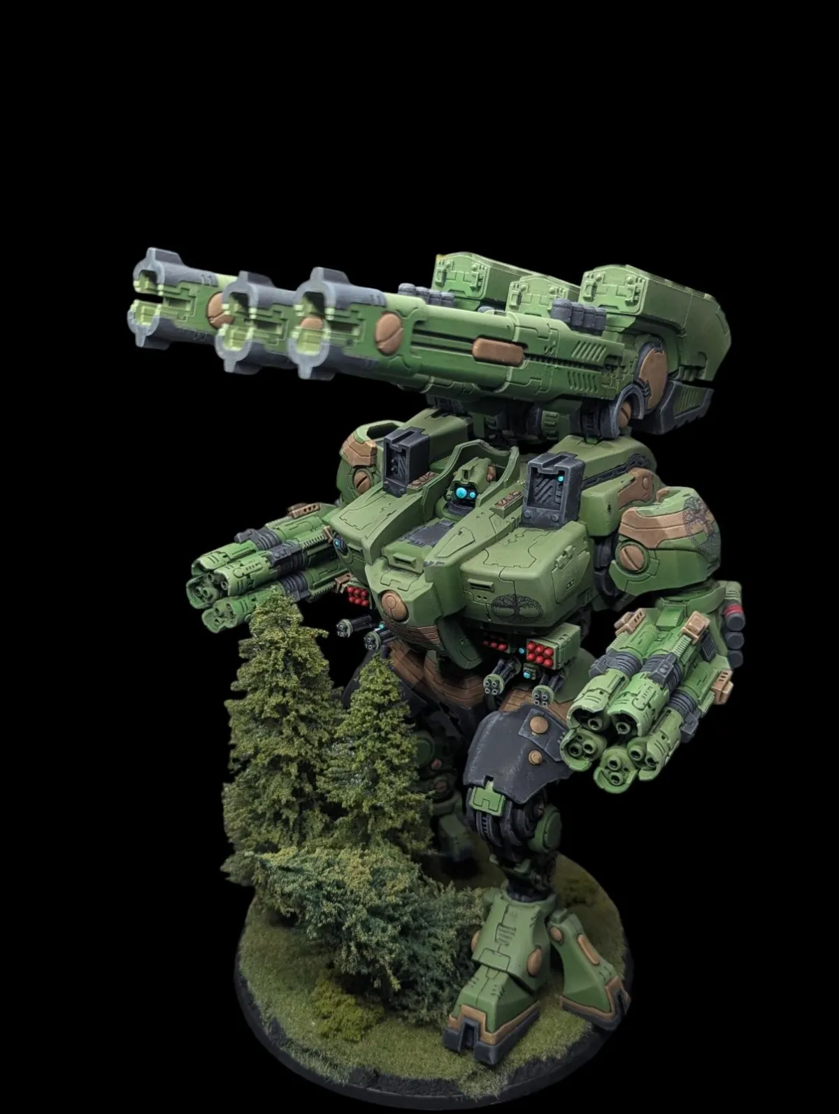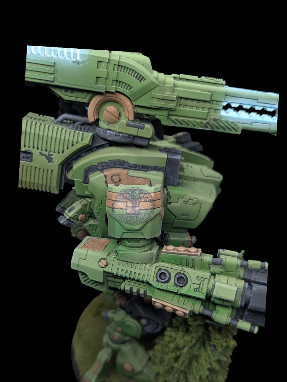 The customer also requested custom iconography inspired by a Celtic Tree of Life to represent their army and identity. The artist designed the emblem from the ground up, produced custom decals in-house, and meticulously applied them to the arms and chest. The symbol doesn’t just sit on the model; it feels woven into its story. Painted to integrate into their custom Kroot-led force, this Ta’unar serves as an auxiliary Tau artillery platform and a towering fusion of advanced technology, family sentiment, and personal heritage. More than just a centerpiece model, this project stands as a reminder that sometimes the most powerful forces on the battlefield begin with something simple: a thoughtful gift at Christmas.